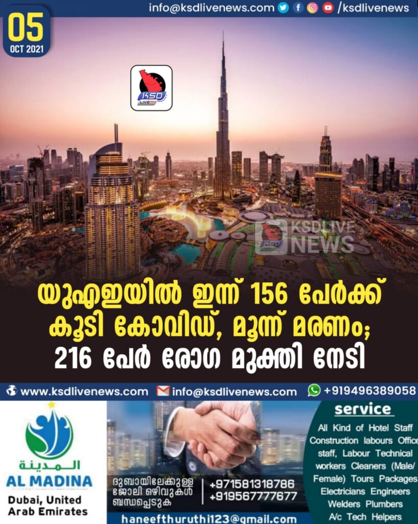 യുഎഇയില്‍ ഇന്ന് 156 പേര്‍ക്ക് കൂടി കോവിഡ്, മൂന്ന് മരണം ; 216 പേർ രോഗ മുക്തി നേടി