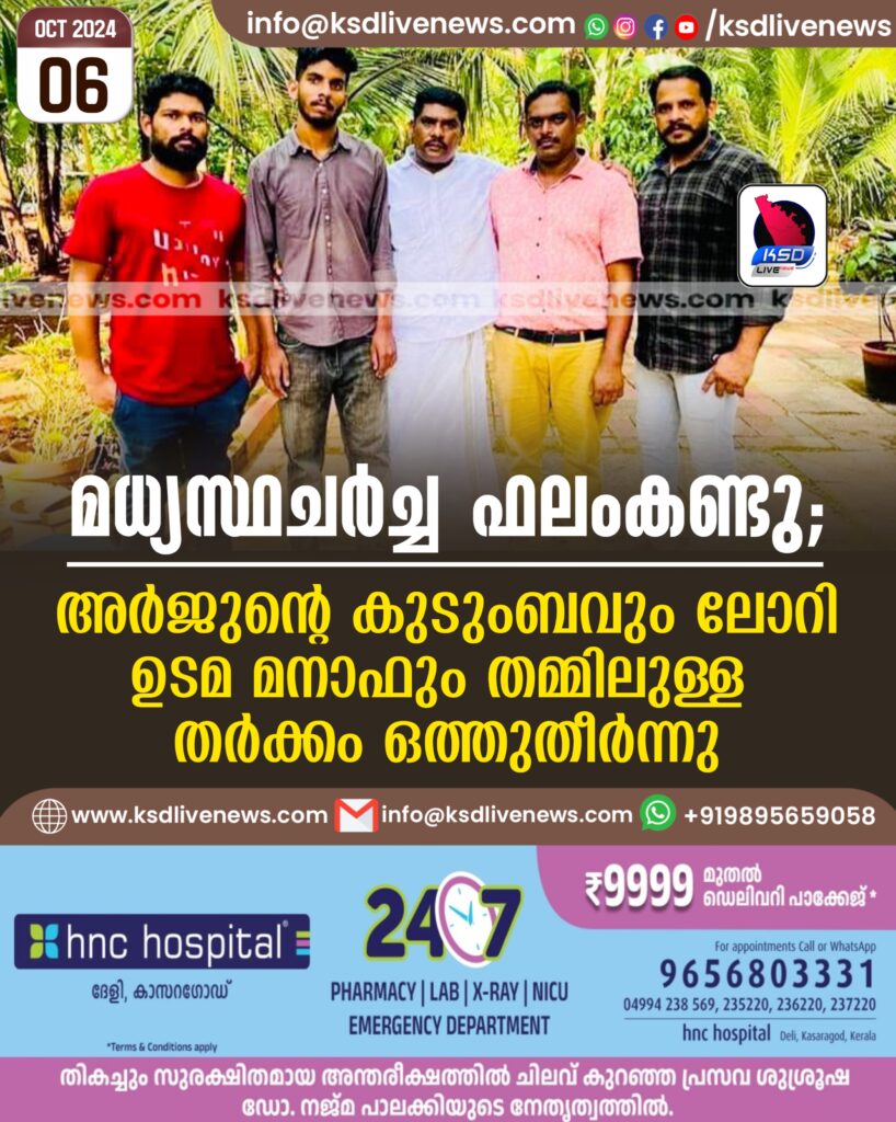 മധ്യസ്ഥചര്ച്ച ഫലംകണ്ടു; അര്ജുന്റെ കുടുംബവും ലോറി ഉടമ മനാഫും തമ്മിലുള്ള തര്ക്കം ഒത്തുതീര്ന്നു