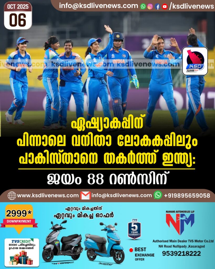 ഏഷ്യാകപ്പിന് പിന്നാലെ വനിതാ ലോകകപ്പിലും പാകിസ്താനെ തകർത്ത് ഇന്ത്യ: ജയം 88 റൺസിന്