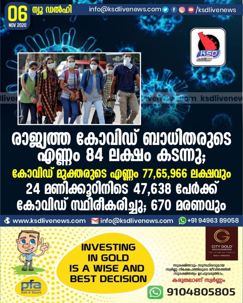 രാജ്യത്ത കോവിഡ് ബാധിതരുടെ എണ്ണം 84 ലക്ഷം കടന്നു ; കോവിഡ് മുക്തരുടെ എണ്ണം 77,65,966 ലക്ഷവും ;