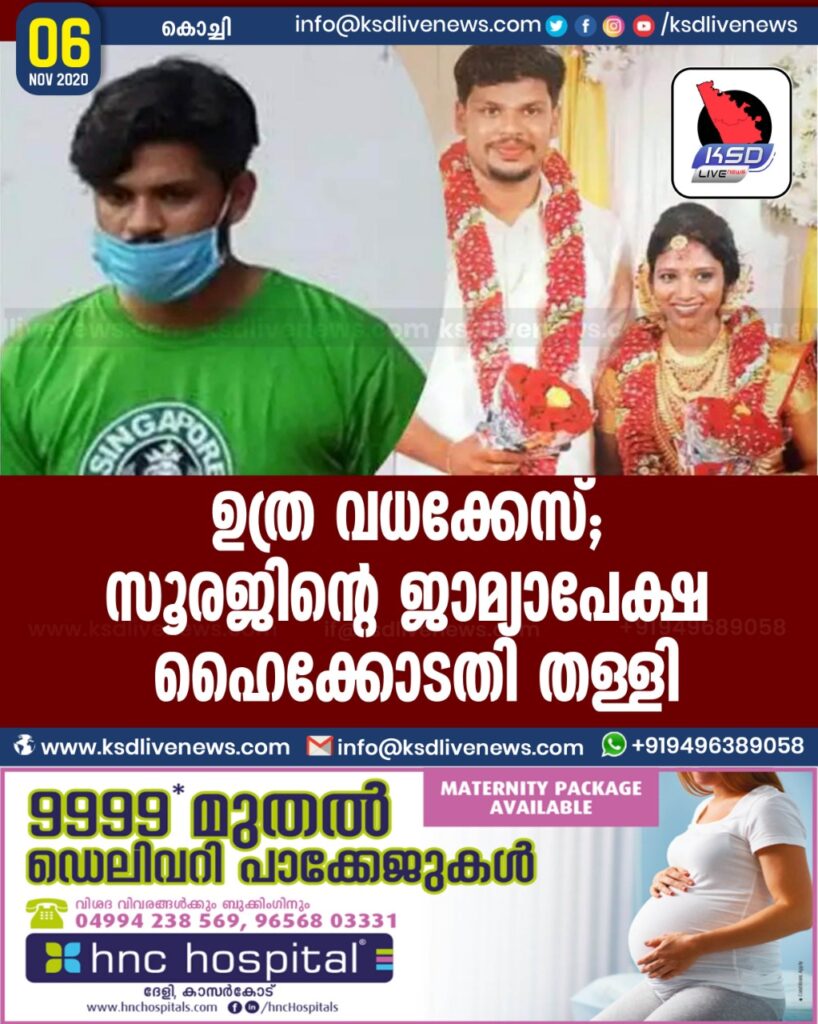 കൊച്ചി: ഉത്ര വധക്കേസില്‍ പ്രതി സൂരജിന്റെ ജാമ്യാപേക്ഷ തള്ളി ഹൈക്കോടതി.
