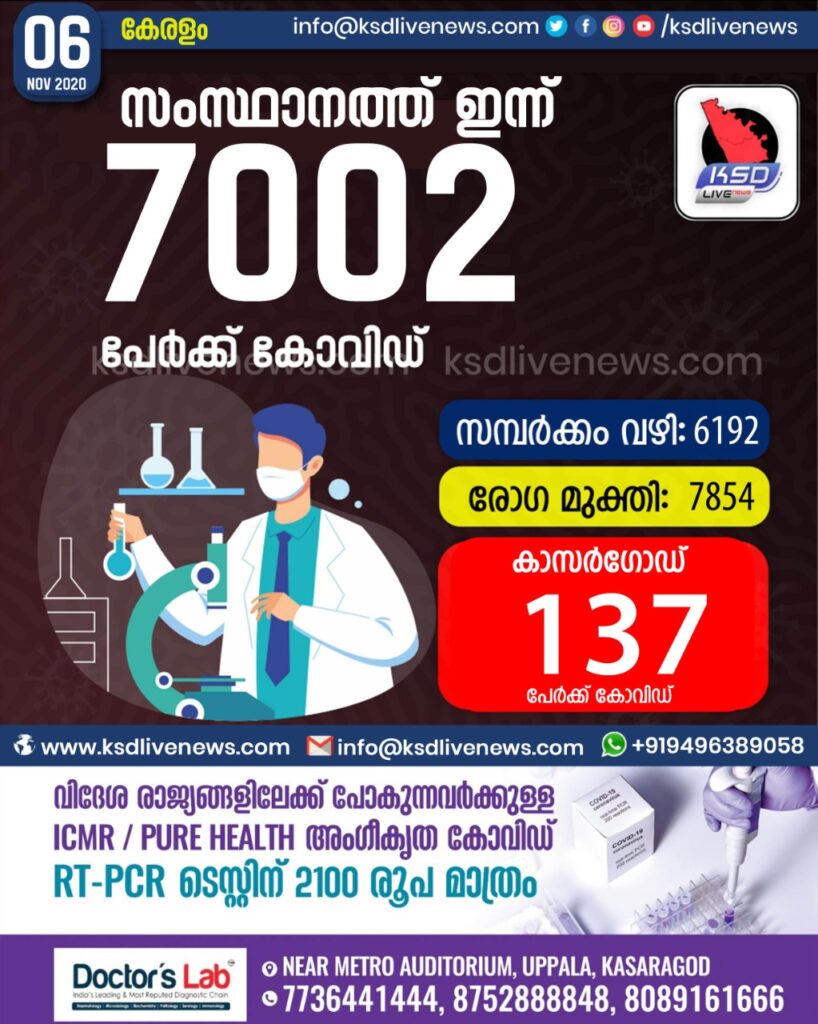 സംസ്ഥാനത്ത് ഇന്ന് 7002 പേർക്ക് കോവിഡ് സ്ഥിരീകരിച്ചു. സമ്പർക്കം വഴി 6192 പേർക്കും ; ആശ്വാസമായി 7854 പേർക്ക് രോഗ മുക്തിയും ; ഉറവിടം അറിയാത്തത് 646 ; കാസർഗോഡ് ജില്ലയിൽ 137 പേർക്ക് പുതിയ കോവിഡ് കേസുകൾ ; മരണം 27