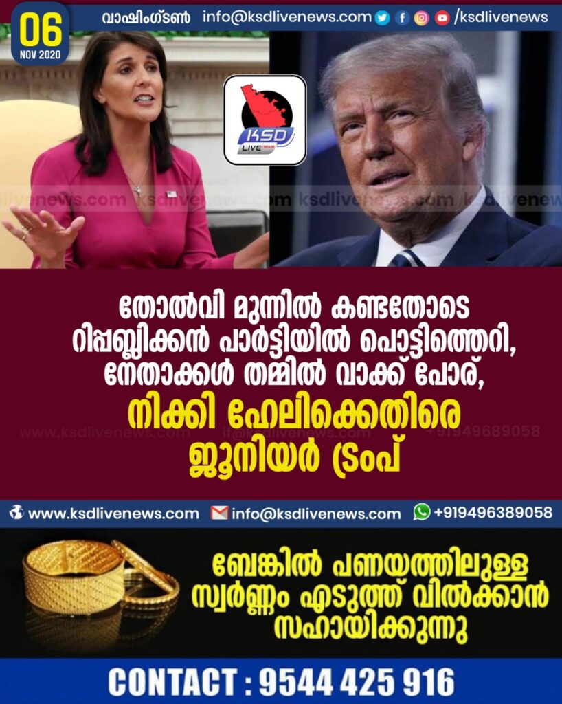 തോൽവി മുന്നിൽ കണ്ടതോടെ റിപ്പബ്ലിക്കൻ പാർട്ടിയിൽ പൊട്ടിത്തെറി , നേതാക്കൾ തമ്മിൽ വാക്ക് പോര് , നിക്കി ഹേലിക്കെതിരെ ജൂനിയർ ട്രംപ്