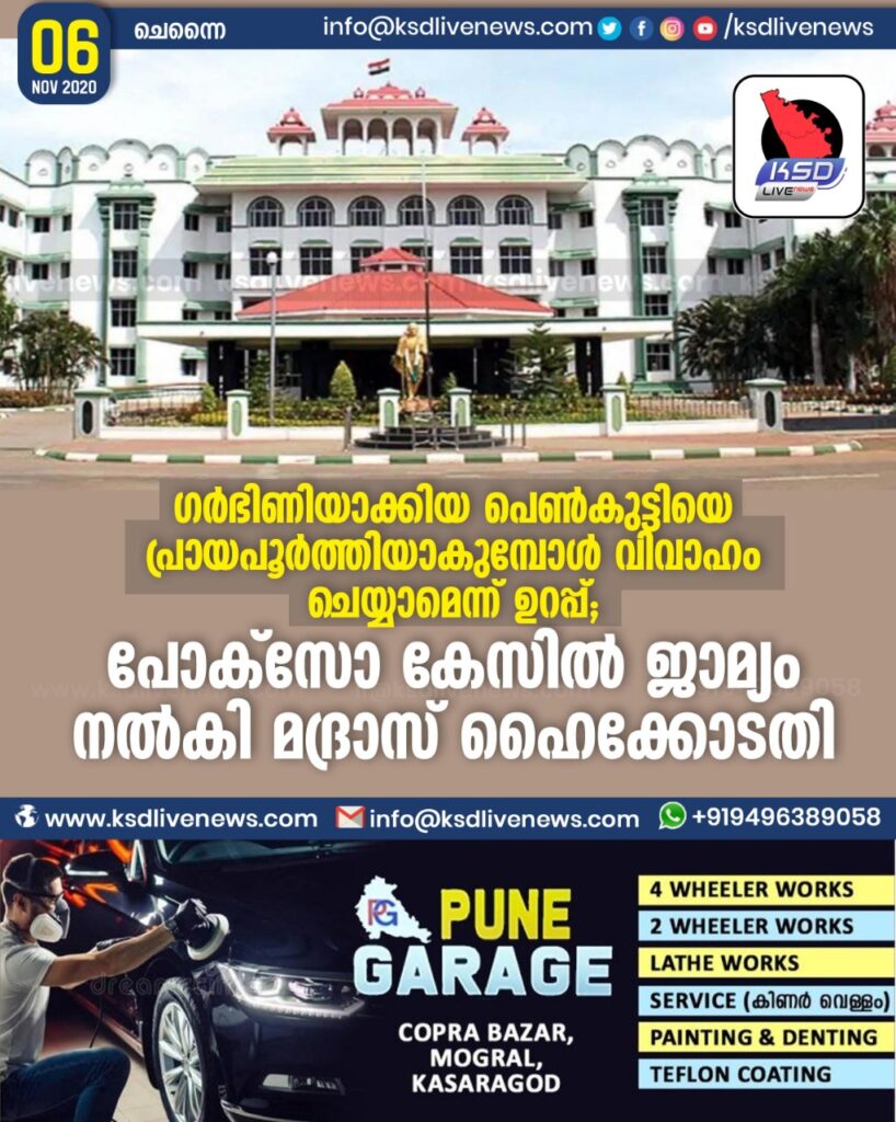 ഗർഭിണിയാക്കിയ പെൺകുട്ടിയെ പ്രായപൂർത്തിയാകുമ്പോൾ വിവാഹം ചെയ്യാമെന്ന് ഉറപ്പ് ; പോക്സോ കേസിൽ ജാമ്യം നൽകി മദ്രാസ് ഹൈക്കോടതി