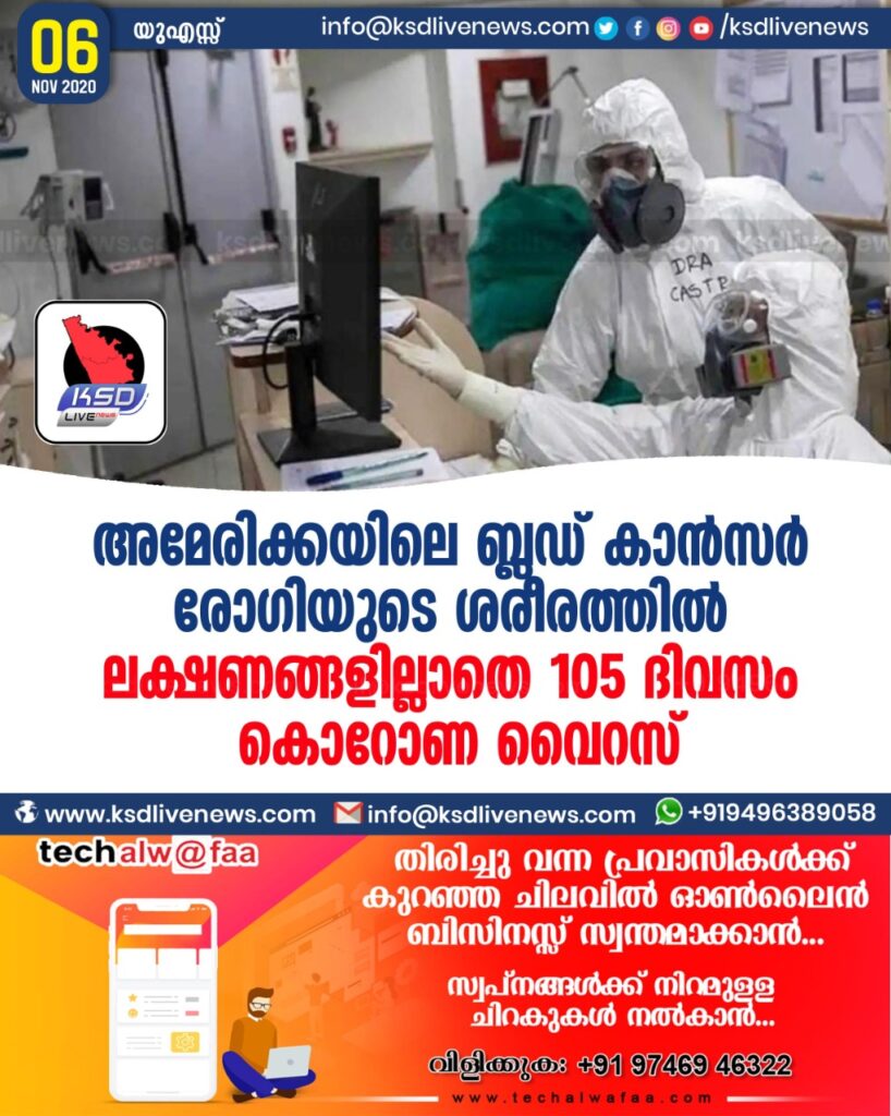 അമേരിക്കയിലെ ബ്ലഡ് കാൻസർ രോഗിയുടെ ശരീരത്തിൽ ലക്ഷണങ്ങളില്ലാതെ 105 ദിവസം കൊറോണ വൈറസ്