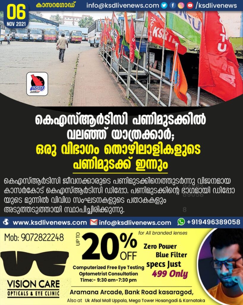 ശമ്പള പരിഷ്കരണം നടപ്പിലാക്കുക, എംപാനൽ ജീവനക്കാരെ സംരക്ഷിക്കുക, ബസ് സർവീസ് കാര്യക്ഷമമാക്കുക തുടങ്ങിയ ആവശ്യങ്ങളുന്നയിച്ചു കെഎസ്ആർടിഇഎ(സിഐടിയു)യുടെ നേതൃത്വത്തിൽ പണിമുടക്കിയ ജീവനക്കാർ കാസർകോട് ഡിപ്പോയിൽ പ്രകടനവും പൊതുയോഗവും നടത്തി. വിശദീകരണ പൊതുയോഗം സംസ്ഥാന ഓർഗനൈസിങ് സെക്രട്ടറി മോഹൻ കുമാർ പാടി ഉദ്ഘാടനം ചെയ്തു. പി.വി.രതീശൻ അധ്യക്ഷത വഹിച്ചു. എം.എസ്.കൃഷ്ണകുമാർ, രശ്മി നാരായൺ, സി.ബാലകൃഷ്ണൻ, കെ.പി.ഷൈജു എന്നിവർ പ്രസംഗിച്ചു.