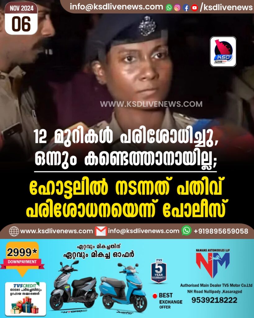 12 മുറികൾ പരിശോധിച്ചു, ഒന്നും കണ്ടെത്താനായില്ല; ഹോട്ടലിൽ നടന്നത് പതിവ് പരിശോധനയെന്ന് പോലീസ്