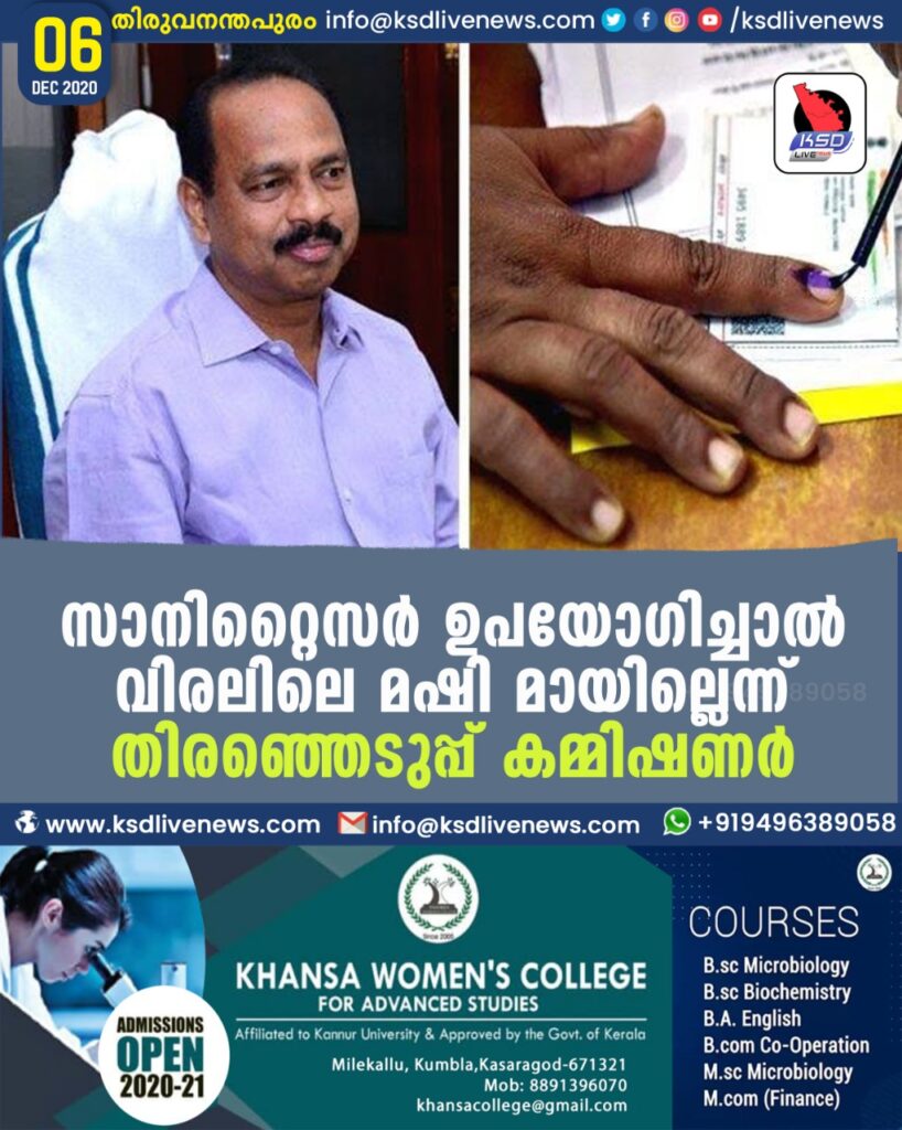 സാനിറ്റൈസര് ഉപയോഗിച്ചാല് വിരലിലെ മഷി മായില്ലെന്ന് തിരഞ്ഞെടുപ്പ് കമ്മിഷണര്