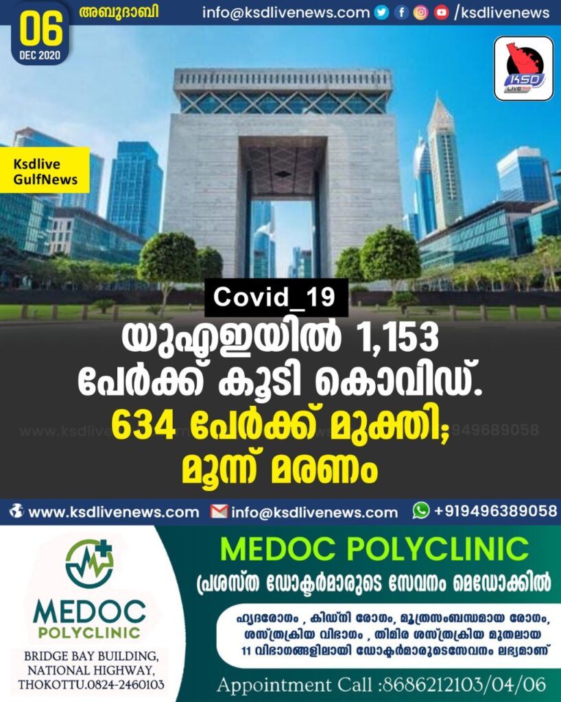 യുഎഇയില് 1,153 പേര്ക്ക് കൂടി കൊവിഡ്. 634 പേർക്ക് മുക്തി ; മൂന്ന് മരണം