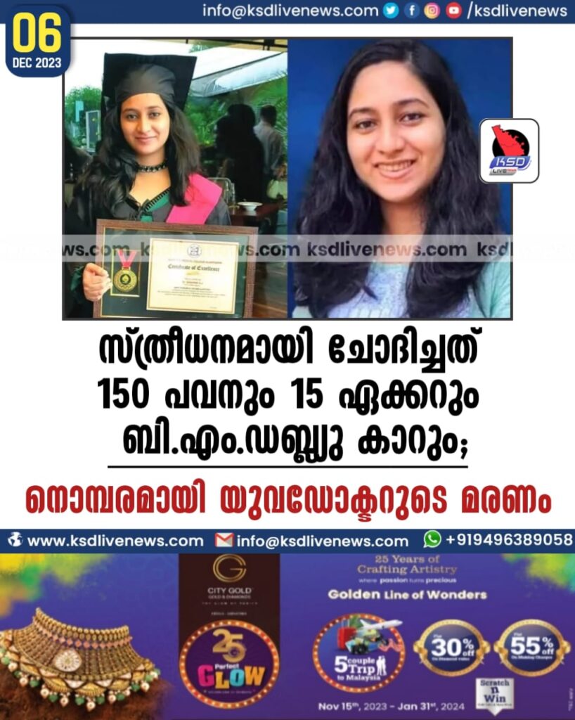 സ്ത്രീധനമായി ചോദിച്ചത് 150 പവനും 15 ഏക്കറും BMW കാറും; നൊമ്പരമായി യുവഡോക്ടറുടെ മരണം