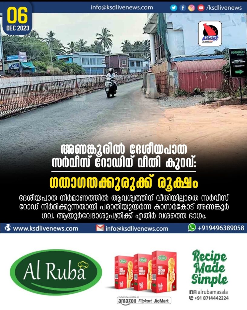 അണങ്കൂരിൽ ദേശീയപാത സർവീസ് റോഡിന് വീതി കുറവ്: ഗതാഗതക്കുരുക്ക് രൂക്ഷം