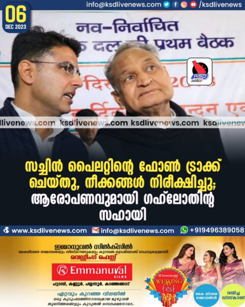 ജയ്പുർ: രാജസ്ഥാനിൽ കോൺഗ്രസിനേറ്റ കനത്ത തിരിച്ചടിക്ക് പിന്നാലെ അശോക് ഗഹ്ലോതിനെതിരേ ആരോപണങ്ങളുമായി അദ്ദേഹത്തിന്റെ ഒ.എസ്.ഡി. (ഓഫീസർ ഓൺ സ്പെഷ്യൽ ഡ്യൂട്ടി) ആയിരുന്നു ലോകേഷ് ശർമ്മ. 2020-ൽ അശോക് ഗഹ്ലോതിന്റെ നേതൃത്വത്തിൽ സച്ചിൻ പൈലറ്റിന്റെ നീക്കങ്ങൾ നിരീക്ഷിച്ചുവെന്നാണ് ലോകേഷ് ശർമ്മയുടെ വെളിപ്പെടുത്തൽ. സച്ചിൻ പൈലറ്റിന്റെ നേതൃത്വത്തിൽ വിമത നീക്കത്തെക്കുറിച്ചുള്ള സൂചനകൾ ലഭിച്ചതിന് പിന്നാലെയാണ് അശോക് ഗഹ്ലോത് സർക്കാർ പൈലറ്റിന്റെ നീക്കങ്ങൾ നിരീക്ഷിക്കുകയും ഫോൺ വിവരങ്ങൾ ചോർത്തി നിരീക്ഷിക്കുകയും ചെയ്തതെന്ന് ലോകേഷ് ശർമ്മ വെളിപ്പെടുത്തിയത്. 2020-ൽ സച്ചിൻ പൈലറ്റ് ഉപമുഖ്യമന്ത്രി ആയിരിക്കുമ്പോഴാണ് വിമതനീക്കം നടക്കുന്നത്. ഭരണ നേതൃമാറ്റം ആവശ്യപ്പെട്ട് ഒരുകൂട്ടം കോൺഗ്രസ് എം.എൽ.എമാർക്കൊപ്പമായിരുന്നു സച്ചിൻ പൈലറ്റിന്റെ വിമത നീക്കം. എന്നാൽ പിന്നീട് ഈ നീക്കം പൊളിയുകയും സച്ചിൻ പൈലറ്റിന്റെ ഉപമുഖ്യമന്ത്രി സ്ഥാനം തെറിക്കുന്നതിലേക്കടക്കം കാര്യങ്ങൾ നീങ്ങുകയും ചെയ്തിരുന്നു. 2020-ലെ രാജസ്ഥാനിലെ രാഷ്ട്രീയ പ്രതിസന്ധിയിൽ 18 എം.എൽ.എമാരുമായാണ് സച്ചിൻ പൈലറ്റ് വിമത നീക്കം നടത്തിയത്. ഈ സാഹചര്യത്തിലാണ് സർക്കാരിന്റെ നേതൃത്വത്തിൽ എല്ലാവരേയും നിരീക്ഷിക്കാൻ വേണ്ടിയുള്ള സംവിധാനം ഏർപ്പെടുത്തിയത്. ഇവർ എവിടെയൊക്കെ പോകുന്നു, ആരെയൊക്കെ കാണുന്നു, ആരോടൊക്കെ സംസാരിക്കുന്നു എന്ന കാര്യങ്ങൾ കൃത്യമായി നിരീക്ഷിച്ചുവെന്ന് ലോകേഷ് ശർമ്മ ആരോപിച്ചു. അതുകൊണ്ട് തന്നെ അവരിൽ പലരേയും പാർട്ടിയിലേക്ക് തിരിച്ചെത്തിക്കാൻ സാധിച്ചുവെന്നും അദ്ദേഹം എ.എൻ.ഐയ്ക്ക് നൽകിയ അഭിമുഖത്തിൽ വെളിപ്പെടുത്തി.