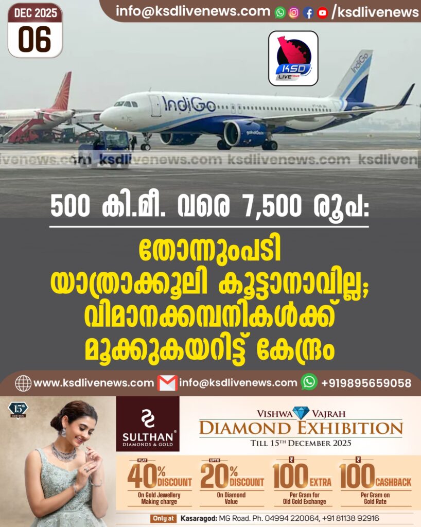 500 കി.മീ. വരെ 7,500 രൂപ: തോന്നുംപടി യാത്രാക്കൂലി കൂട്ടാനാവില്ല; വിമാനക്കമ്പനികൾക്ക് മൂക്കുകയറിട്ട് കേന്ദ്രം