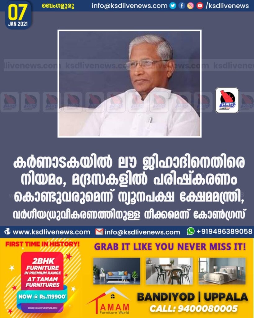 കര്ണാടകയില് ലൗ ജിഹാദിനെതിരെ നിയമം, മദ്രസകളില് പരിഷ്കരണം കൊണ്ടുവരുമെന്ന് ന്യൂനപക്ഷ ക്ഷേമമന്ത്രി, വര്ഗീയധ്രുവീകരണത്തിനുള്ള നീക്കമെന്ന് കോണ്ഗ്രസ്