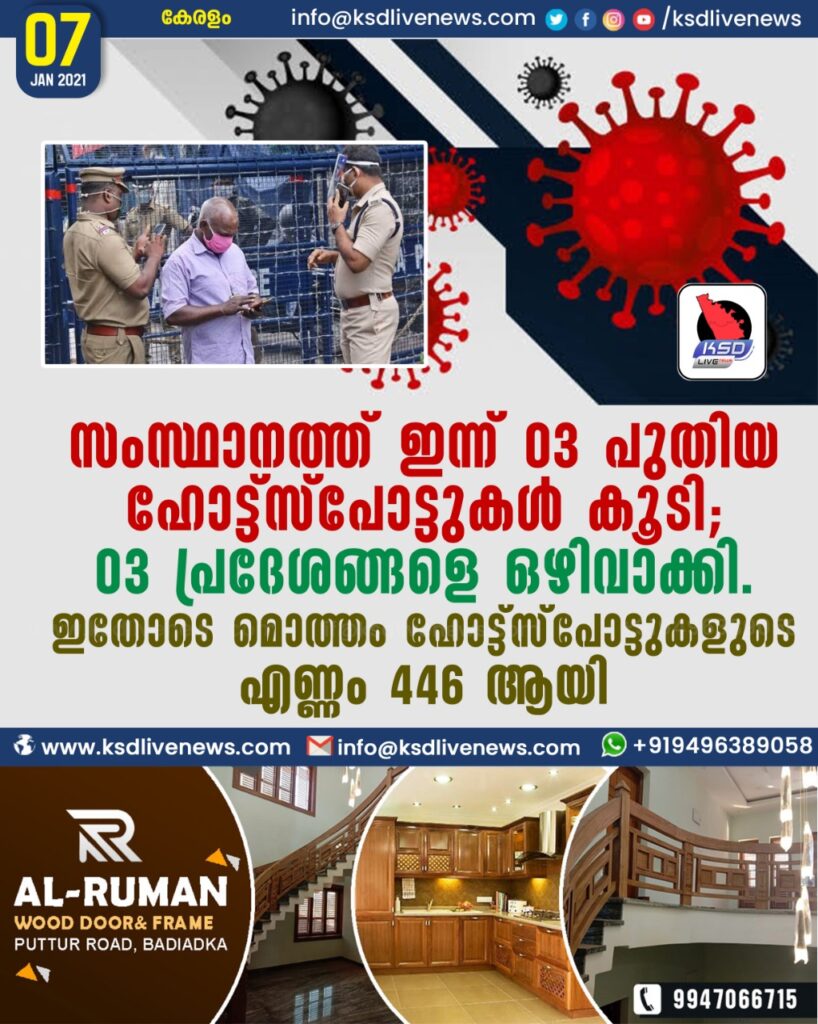 സംസ്ഥാനത്ത് ഇന്ന് 03 പുതിയ ഹോട്ട്സ്പോട്ടുകള് കൂടി; 03 പ്രദേശങ്ങളെ ഒഴിവാക്കി. ഇതോടെ മൊത്തം ഹോട്ട്സ്പോട്ടുകളുടെ എണ്ണം 446 ആയി.