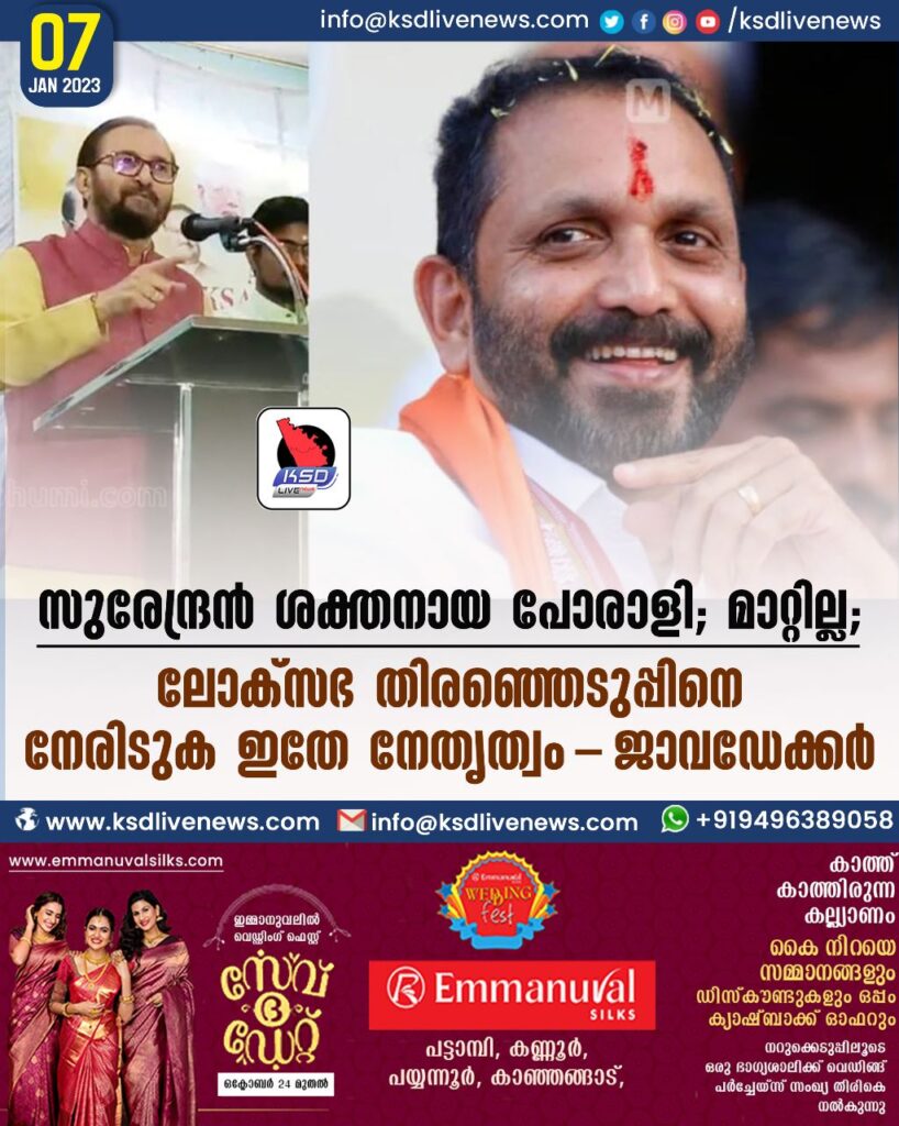 സുരേന്ദ്രന്‍ ശക്തനായ പോരാളി, മാറ്റില്ല; ലോക്‌സഭ തിരഞ്ഞെടുപ്പിനെ നേരിടുക ഇതേ നേതൃത്വം- ജാവഡേക്കര്‍