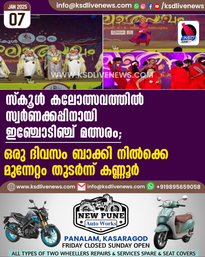 സ്കൂള് കലോത്സവത്തില് സ്വര്ണക്കപ്പിനായി ഇഞ്ചോടിഞ്ച് മത്സരം; ഒരു ദിവസം ബാക്കി നില്ക്കെ മുന്നേറ്റം തുടര്ന്ന് കണ്ണൂര്