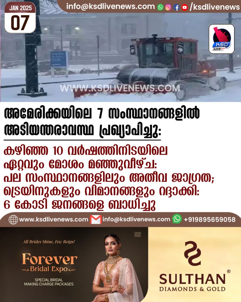 അമേരിക്കയിലെ 7 സംസ്ഥാനങ്ങളില് അടിയന്തരാവസ്ഥ പ്രഖ്യാപിച്ചു. കഴിഞ്ഞ 10 വര്ഷത്തിനിടയിലെ ഏറ്റവും മോശം മഞ്ഞുവീഴ്ച, പല സംസ്ഥാനങ്ങളിലും അതീവ ജാഗ്രത, ട്രെയിനുകളും വിമാനങ്ങളും റദ്ദാക്കി. 6 കോടി ജനങ്ങളെ ബാധിച്ചു.