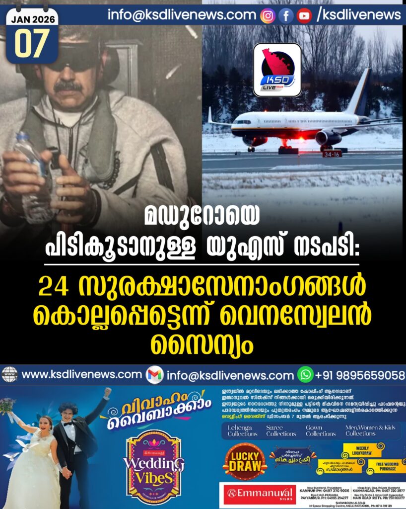 മഡുറോയെ പിടികൂടാനുള്ള യുഎസ് നടപടി: 24 സുരക്ഷാസേനാംഗങ്ങൾ കൊല്ലപ്പെട്ടെന്ന് വെനസ്വേലൻ സൈന്യം