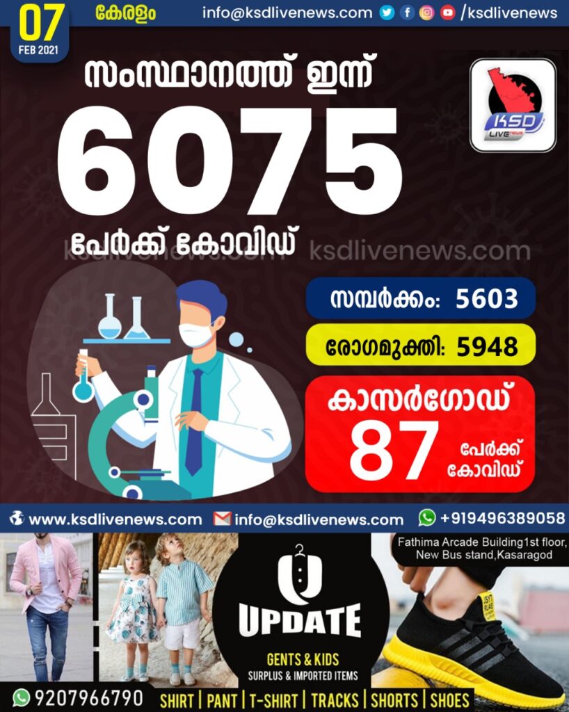 സംസ്ഥാനത്ത് ഇന്ന് 6075 പേർക്ക് കോവിഡ് സ്ഥിരീകരിച്ചു. സമ്പർക്കം വഴി 5603 പേർക്കും ; ആശ്വാസമായി 5948 പേർക്ക് രോഗ മുക്തിയും ; കാസർഗോഡ് ജില്ലയിൽ 87 പേർക്ക് പുതിയ കോവിഡ് കേസുകൾ ; മരണം 19