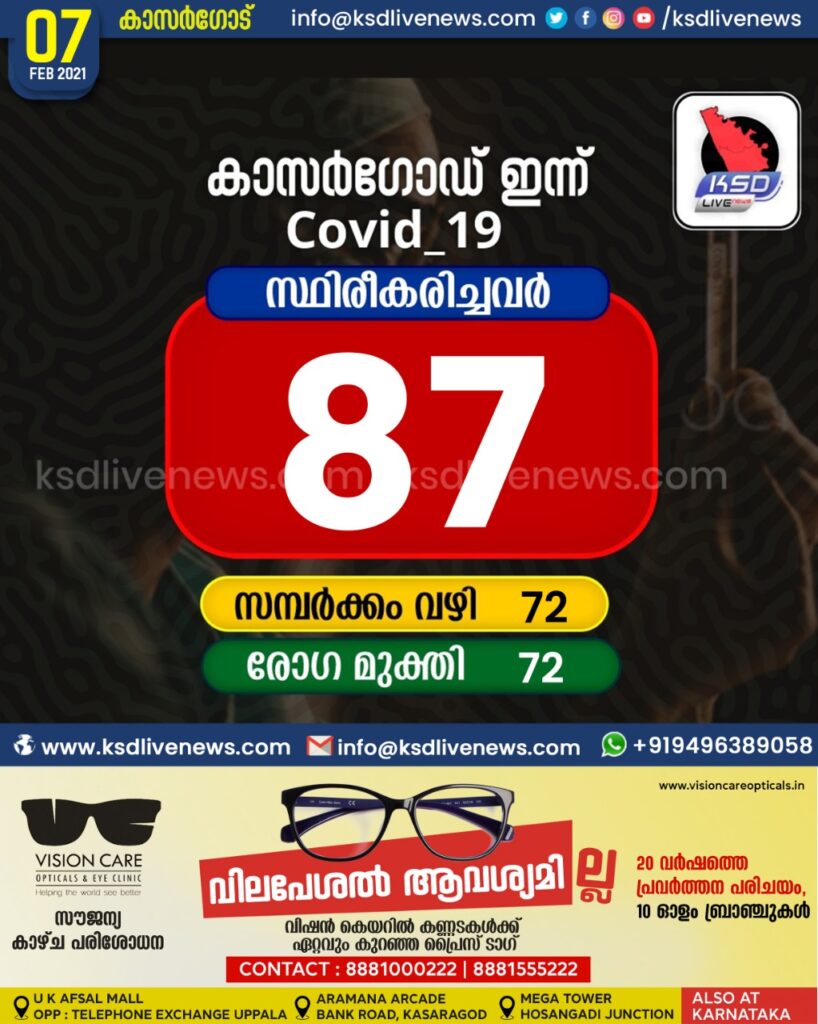 കാസര്കോട് ജില്ലയില് 87 പേര്ക്ക് കൂടി കോവിഡ് സ്ഥിരീകരിച്ചു. ചികിത്സയിലുണ്ടായിരുന്ന 72 പേര്ക്ക് രോഗം ഭേദമായി.