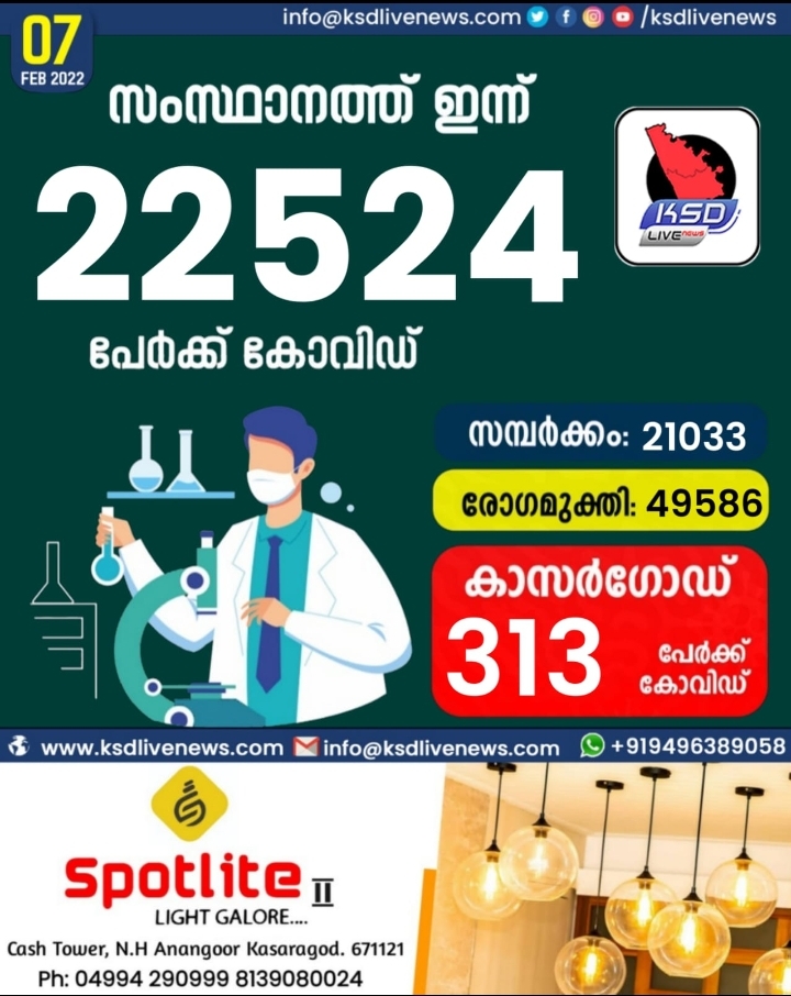 സംസ്ഥാനത്ത് ഇന്ന് 22525 കോവിഡ് സ്ഥിരീകരിച്ചു. സമ്പർക്കം വഴി 21033 പേർക്കും ; ആശ്വാസമായി 49586 പേർക്ക് രോഗമുക്തി ; കാസർഗോഡ് ജില്ലയിൽ 313 പേർക്ക് പുതിയ കോവിഡ് കേസുകൾ ; മരണം 14