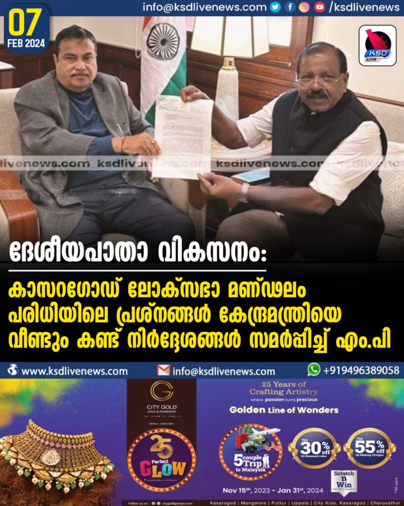 ദേശീയപാതാ വികസനം: കാസറഗോഡ് ലോക്സഭാ മണ്ഢലം പരിധിയിലെ പ്രശ്നങ്ങൾ കേന്ദ്രമന്ത്രിയെ വീണ്ടും കണ്ട് നിര്ദ്ദേശങ്ങള് സമര്പ്പിച്ച് എം.പി