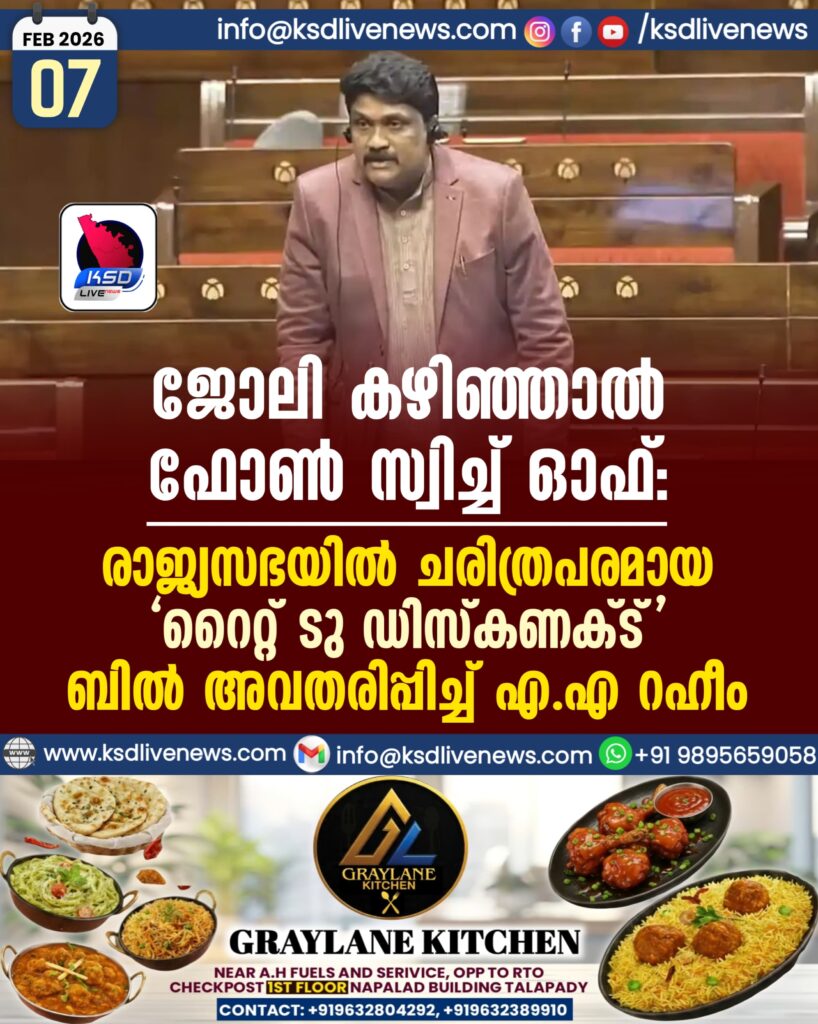 ന്യുഡല്ഹി: ഓഫീസ് സമയം കഴിഞ്ഞാല് ഔദ്യോഗിക ഫോണ് കോളുകളില് നിന്നും ഇമെയിലുകളില് നിന്നും പൂർണ്ണമായും വിട്ടുനില്ക്കാൻ ജീവനക്കാരെ അനുവദിക്കുന്ന ‘റൈറ്റ് ടു ഡിസ്കണക്ട്’ സ്വകാര്യ ബില് എ.എ റഹീം രാജ്യസഭയില് അവതരിപ്പിച്ചു.