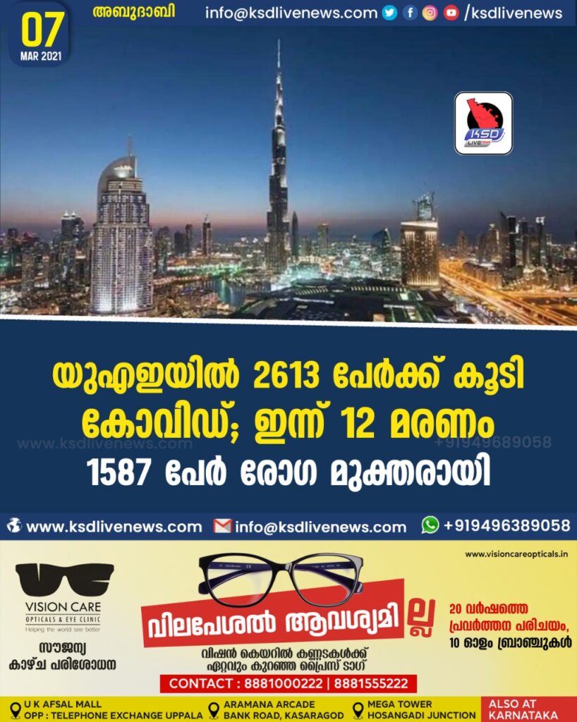 യുഎഇയില് 2613 പേര്ക്ക് കൂടി കോവിഡ്; ഇന്ന് 12 മരണം; 1587പേർ രോഗ മുക്തരായി