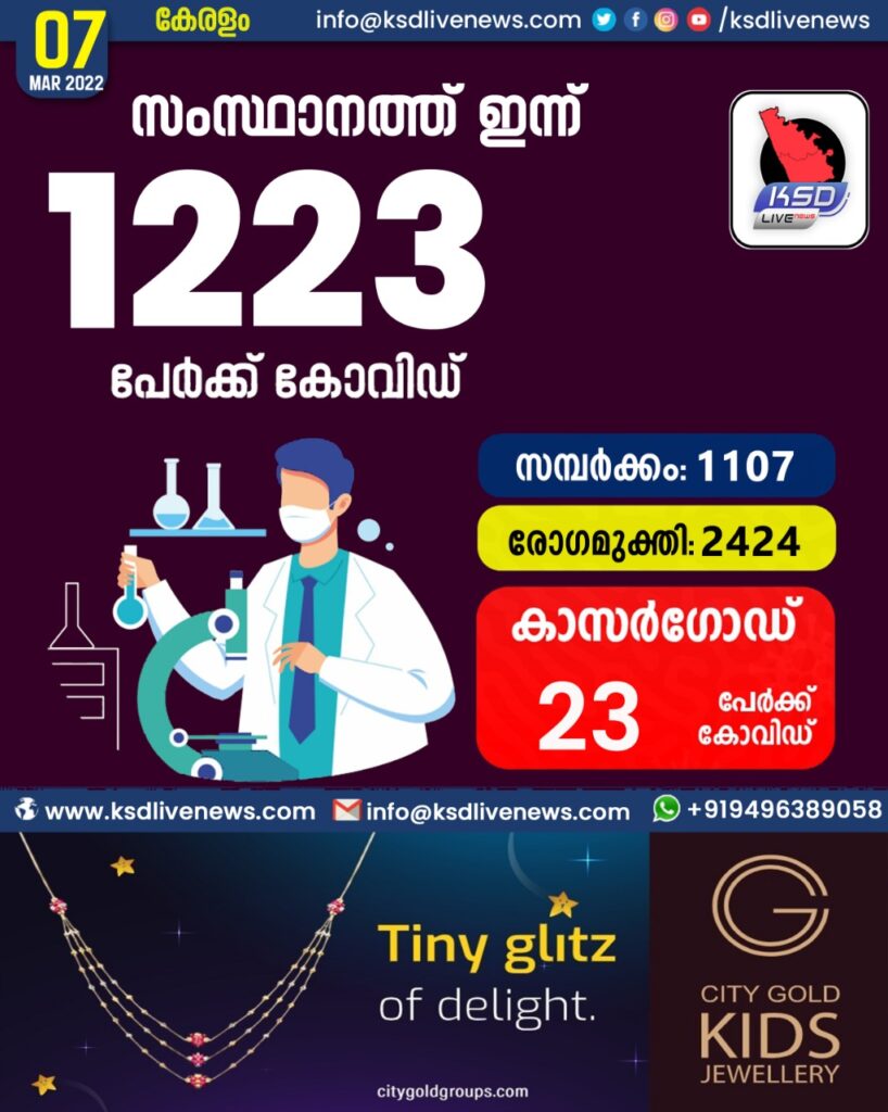 സംസ്ഥാനത്ത് ഇന്ന് 1223 കോവിഡ് സ്ഥിരീകരിച്ചു. സമ്പർക്കം വഴി 1107 പേർക്കും ; ആശ്വാസമായി 2424 പേർക്ക് രോഗമുക്തി ; കാസർഗോഡ് ജില്ലയിൽ 23 പേർക്ക് പുതിയ കോവിഡ് കേസുകൾ ; മരണം 04