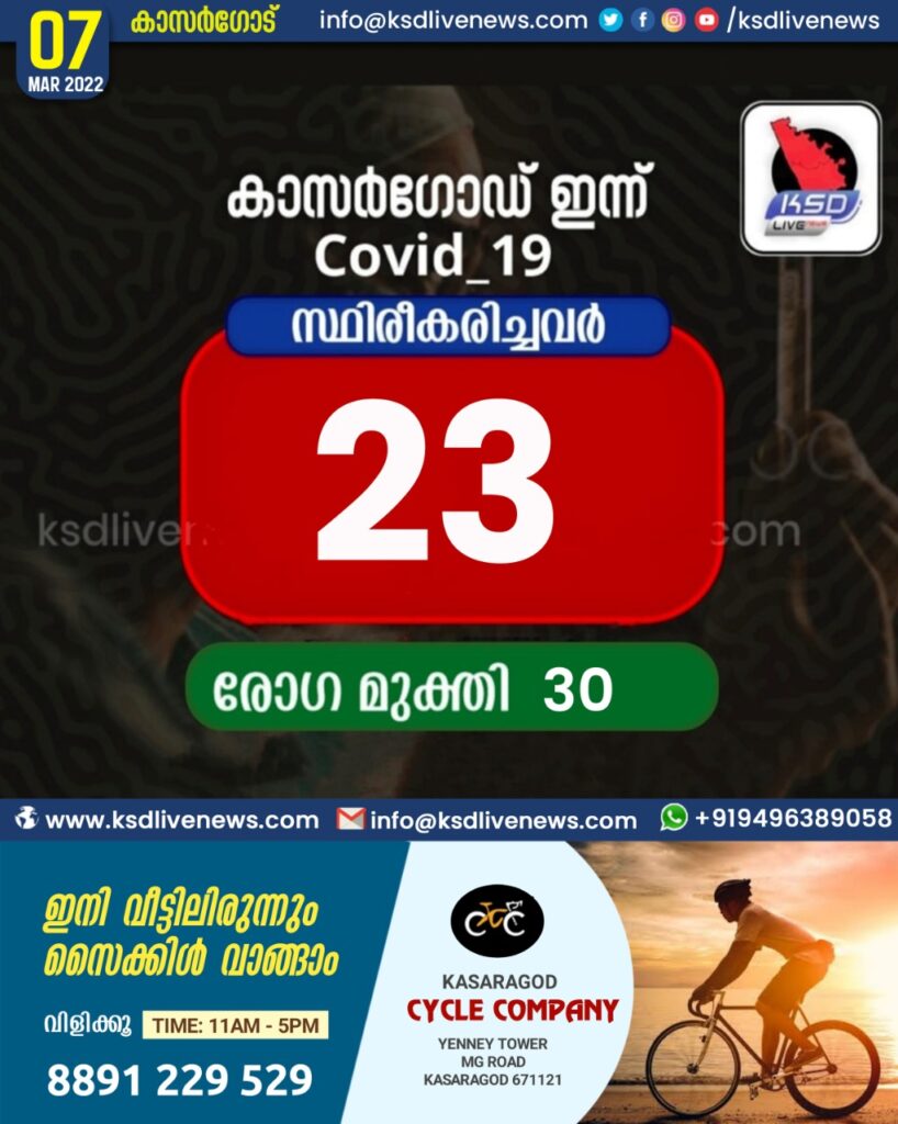കാസർഗോഡ് ജില്ലയിൽ ഇന്ന് 23 പേർക്ക് കോവിഡ് സ്ഥിരീകരിച്ചു. 30 പേർക്ക് രോഗമുക്തി