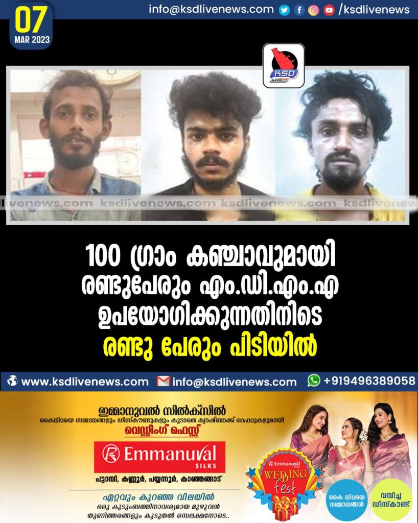 100 ഗ്രാം കഞ്ചാവുമായി രണ്ടുപേരും എം.ഡി.എം.എ ഉപയോഗിക്കുന്നതിനിടെ രണ്ടുപേരും പിടിയില്