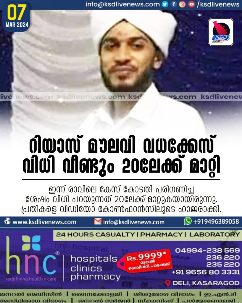 കാസര്കോട്: റിയാസ് മൗലവി വധക്കേസിന്റെ വിധി ജില്ലാ പ്രിന്സിപ്പല് സെഷന്സ് കോടതി മാര്ച്ച് 20ലേക്ക് മാറ്റിവെച്ചു. ഇന്ന് രാവിലെ കേസ് കോടതി പരിഗണിച്ച ശേഷം വിധി പറയുന്നത് 20ലേക്ക് മാറ്റുകയായിരുന്നു. പ്രതികളെ വീഡിയോ കോണ്ഫറന്സിലൂടെ ഹാജരാക്കി.