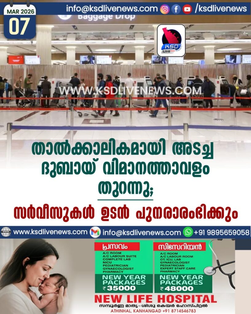 ദുബായ്: സുരക്ഷാ പരിശോധനകളെ തുടർന്ന് അടച്ച ദുബായ് അന്താരാഷ്ട്ര വിമാനത്താവളം വീണ്ടും തുറന്നു. സുരക്ഷാ പരിശോധനകളും നടപടി ക്രമങ്ങളും പൂർത്തിയാക്കിയാണ് വിമാനത്താവളം തുറന്നത്. വിമാനത്താവളത്തിൽ നിന്നുമുള്ള സർവ്വീസുകൾ ഉടൻ പുനരാരംഭിക്കുമെന്ന് അധികൃതർ അറിയിച്ചു. അൽപസമയം മാത്രമാണ് വിമാനത്താവളം അടച്ചിട്ടത്.