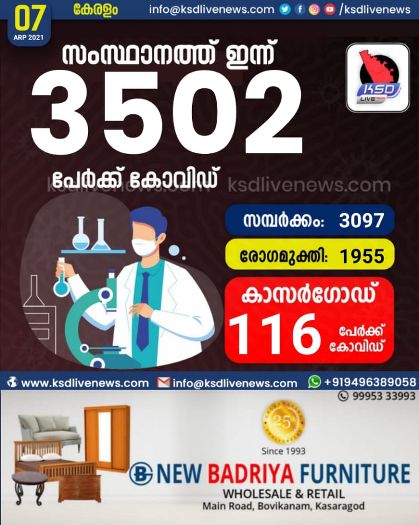 സംസ്ഥാനത്ത് ഇന്ന് 3502 പേർക്ക് കോവിഡ് സ്ഥിരീകരിച്ചു. സമ്പർക്കം വഴി 3097 പേർക്കും ; ആശ്വാസമായി 1955 പേർക്ക് രോഗ മുക്തിയും ; കാസർഗോഡ് ജില്ലയിൽ 116 പേർക്ക് പുതിയ കോവിഡ് കേസുകൾ ; മരണം 16