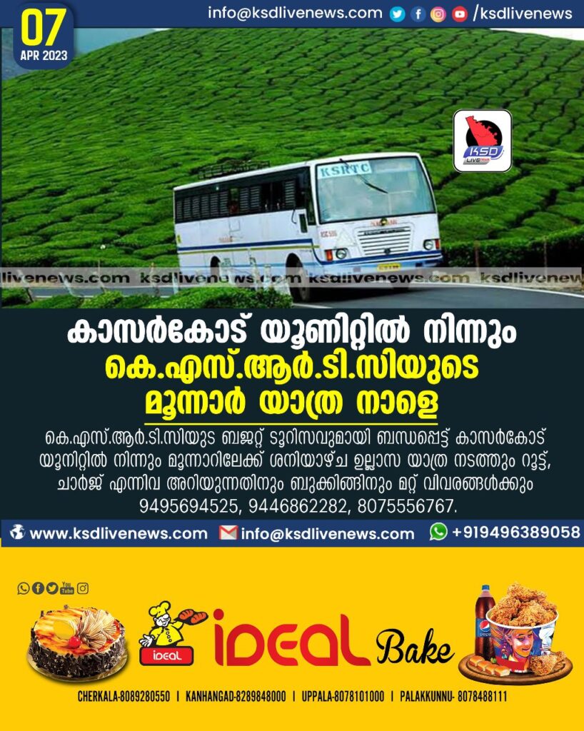 കാസർകോട്: കെ.എസ്.ആര്.ടി.സിയുടെ ബജറ്റ് ടൂറിസവുമായി ബന്ധപ്പെട്ട് കാസര്കോട് യൂനിറ്റില് നിന്നും മൂന്നാറിലേക്ക് ശനിയാഴ്ച ഉല്ലാസ യാത്ര നടത്തും. ഇടുക്കിയിലെ ഫോട്ടോ പോയിൻറ്, ടോപ് സ്റ്റേഷന്, കുണ്ടള ഡാം, ഇക്കോ-പോയൻറ്, മാട്ടുപെട്ടി ഡാം, ബൊട്ടാണിക്കല് ഗാര്ഡന്, ഫ്ലവര് ഗാര്ഡന്, രണ്ടാം ദിവസം ഇരവിക്കുളം നാഷനല് പാര്ക്ക്, മറയൂര് ശര്ക്കര ഫാക്ടറി, മുനിയറകള്, സാൻറല് വുഡ് ഫോറസ്റ്റ് എന്നീ സ്ഥലങ്ങളാണ് യാത്രയില് ഉള്പ്പെടുത്തിയിരിക്കുന്നത്. റൂട്ട്, ചാര്ജ് എന്നിവ അറിയുന്നതിനും ബുക്കിങ്ങിനും മറ്റ് വിവരങ്ങള്ക്കും 9495694525, 9446862282, 8075556767.