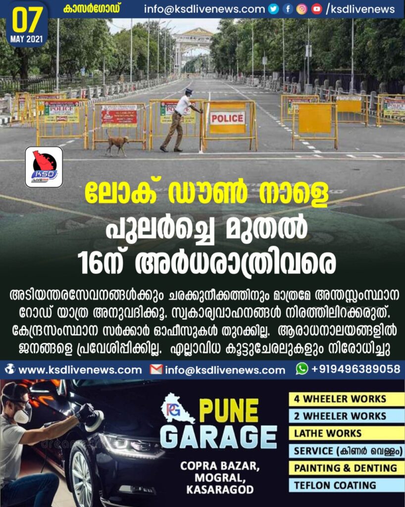 ലോക് ഡൗൺ നാളെ പുലർച്ചെമുതൽ 16-ന് അർധരാത്രിവരെ