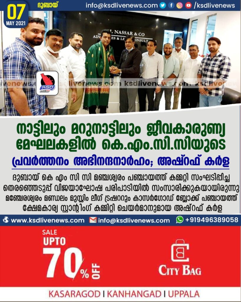 നിയമസഭാ തിരഞ്ഞെടുപ്പിൽ സംഘ് പരിവാർ ശക്തികളുടെ കടന്നു കയറ്റം പ്രതിരോധിച്ച് കൊണ്ട് തുളുനാടിന്റെ മണ്ണിൽ യു.ഡി.എഫ് സ്റ്റാനാർത്ഥിയായി മത്സരിച്ചു ഉന്നത വിജയം നേടിയ നിയുക്ത എം.എൽ.എ എ കെ എം അശ്റഫിനേയും ജനാതിപത്യത്തിന്റെ മഹോൽസവത്തിൽ പങ്കാളികളായി യു ഡി എഫി നു വോട്ട് നൽകിയ മുഴുവൻ ജനാധിപത്യവിശാസികൾക്കും കെ എം സി സി യുടെ നന്ദിയും കടപ്പാടും അറിയിച്ചു.