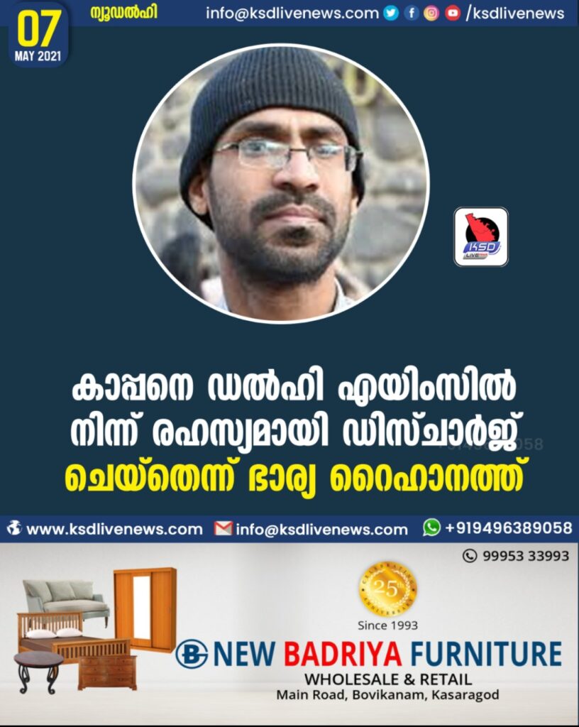 കാപ്പനെ ഡല്‍ഹി എയിംസില്‍ നിന്ന് രഹസ്യമായി ഡിസ്ചാര്‍ജ് ചെയ്തെന്ന് ഭാര്യ റൈഹാനത്ത്