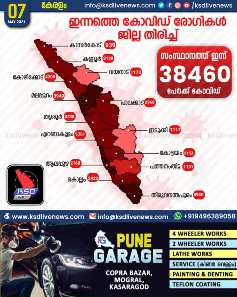 കേരളത്തിൽ ഇന്ന് 38,460 പേർക്ക് കോവിഡ്-19 സ്ഥിരീകരിച്ചു. എറണാകുളം 5361, കോഴിക്കോട് 4200, തിരുവനന്തപുരം 3950, മലപ്പുറം 3949, തൃശൂർ 3738, കണ്ണൂർ 3139, പാലക്കാട് 2968, കൊല്ലം 2422, ആലപ്പുഴ 2160, കോട്ടയം 2153, പത്തനംതിട്ട 1191, വയനാട് 1173, ഇടുക്കി 1117, കാസർഗോഡ് 939 എന്നിങ്ങനേയാണ് ജില്ലകളിൽ ഇന്ന് രോഗ ബാധ സ്ഥിരീകരിച്ചത്