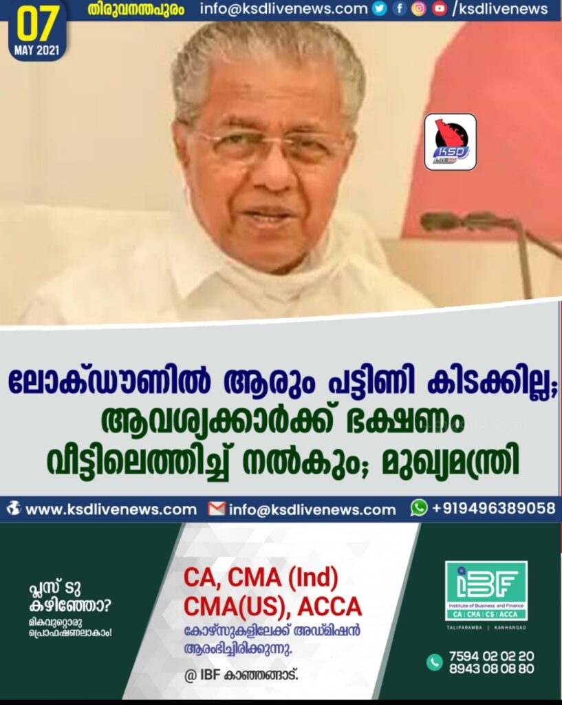 ലോക്ഡൗണില്‍ ആരും പട്ടിണി കിടക്കില്ല; ആവശ്യക്കാര്‍ക്ക് ഭക്ഷണം വീട്ടിലെത്തിച്ച് നല്‍കും -മുഖ്യമന്ത്രി