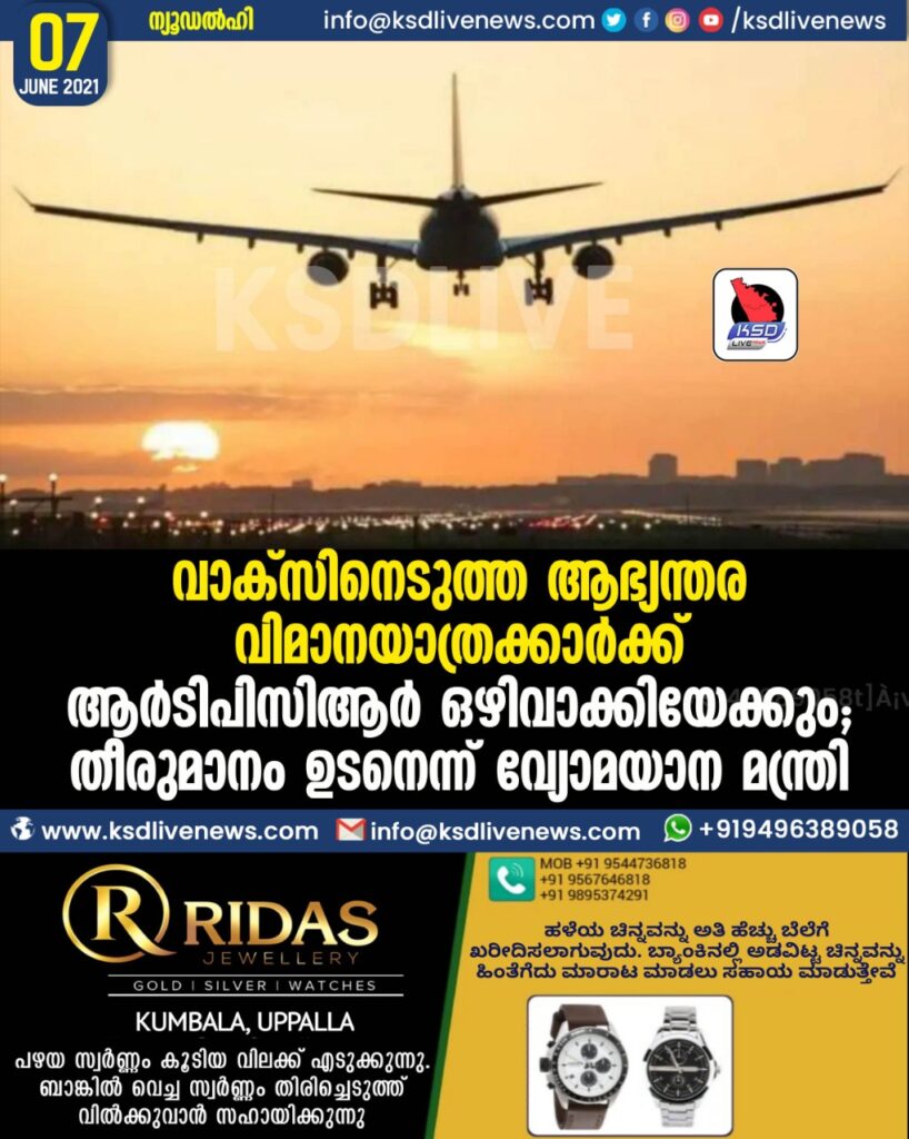 വാക്‌സിനെടുത്ത ആഭ്യന്തര വിമാനയാത്രക്കാര്‍ക്ക് ആര്‍ടിപിസിആര്‍ ഒഴിവാക്കിയേക്കും; തീരുമാനം ഉടനെന്ന് വ്യോമയാന മന്ത്രി