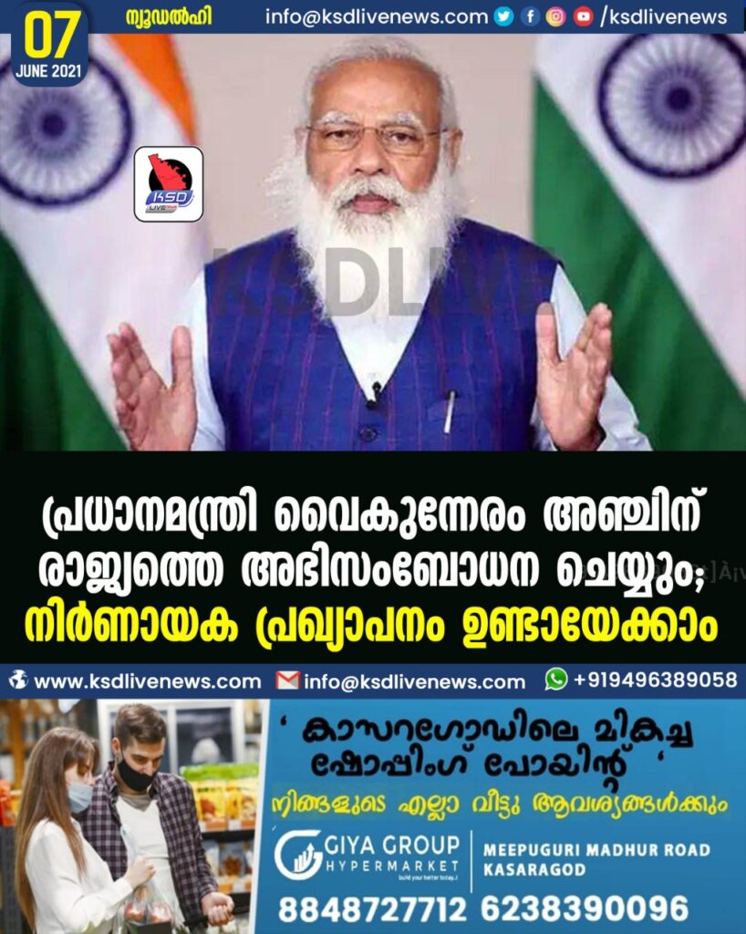 പ്രധാനമന്ത്രി വൈകുന്നേരം അഞ്ചിന് രാജ്യത്തെ അഭിസംബോധന ചെയ്യും; നിര്ണായക പ്രഖ്യാപനം ,ഉണ്ടായേക്കാം