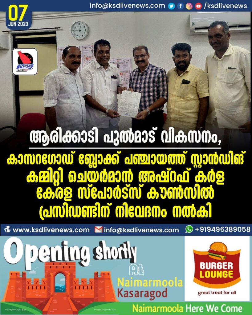 ആരിക്കാടി പുൽമാട് വികസനം, കാസറഗോഡ് ബ്ലോക്ക് പഞ്ചായത്ത് സ്റ്റാൻഡിങ് കമ്മിറ്റി ചെയർമാൻ അഷ്റഫ് കർള കേരള സ്പോർട്സ് കൗൺസിൽ പ്രസിഡണ്ടിന് നിവേദനം നൽകി