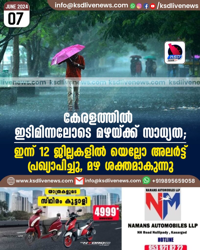 കേരളത്തിൽ ഇടിമിന്നലോടെ മഴയ്ക്ക് സാധ്യത; ഇന്ന് 12 ജില്ലകളിൽ യെല്ലോ അലർട്ട് പ്രഖ്യാപിച്ചു, മഴ ശക്തമാകുന്നു