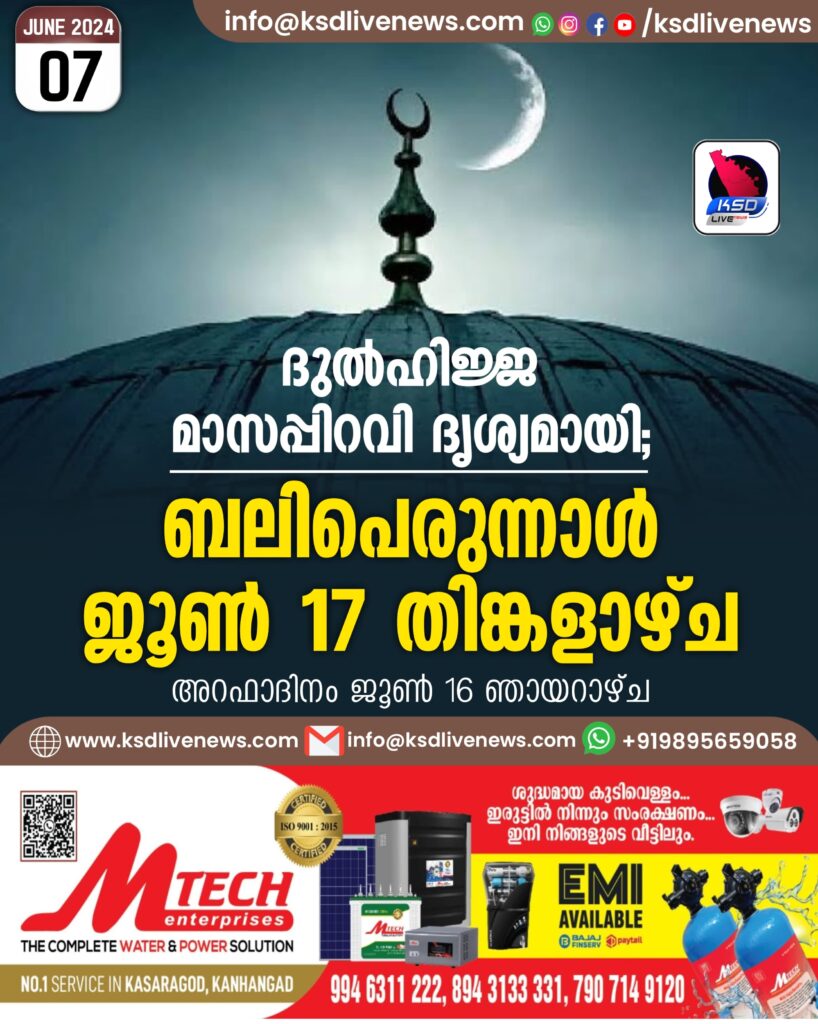 ദുല്ഹിജ്ജ മാസപ്പിറവി ദൃശ്യമായി; ബലിപെരുന്നാള് ജൂണ് 17 തിങ്കളാഴ്ച