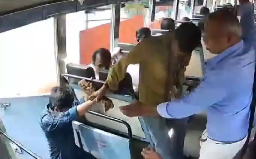 റോഡിലേക്ക് വീഴാൻപോയ യാത്രക്കാരനെ ഒറ്റ കൈയ്യിൽ പിടിച്ചുകയറ്റി കണ്ടക്ടർ, സൂപ്പർ ഹീറോ മിന്നൽ ബിലു