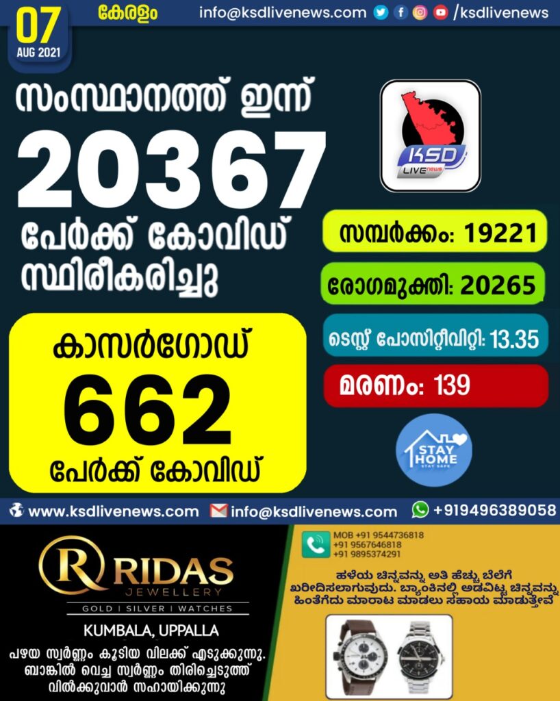 സംസ്ഥാനത്ത് ഇന്ന് 20367 പേർക്ക് കോവിഡ് സ്ഥിരീകരിച്ചു. സമ്പർക്കം വഴി 19221 പേർക്കും ; ആശ്വാസമായി 20265 പേർക്ക് രോഗ മുക്തിയും ; കാസർഗോഡ് ജില്ലയിൽ 662 പേർക്ക് പുതിയ കോവിഡ് കേസുകൾ ; മരണം 139