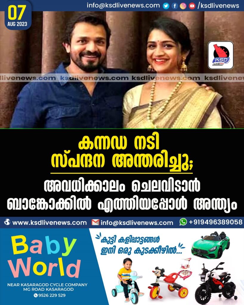 കന്നഡ നടി സ്പന്ദന അന്തരിച്ചു; അവധിക്കാലം ചെലവിടാന് ബാങ്കോക്കില് എത്തിയപ്പോള് അന്ത്യം