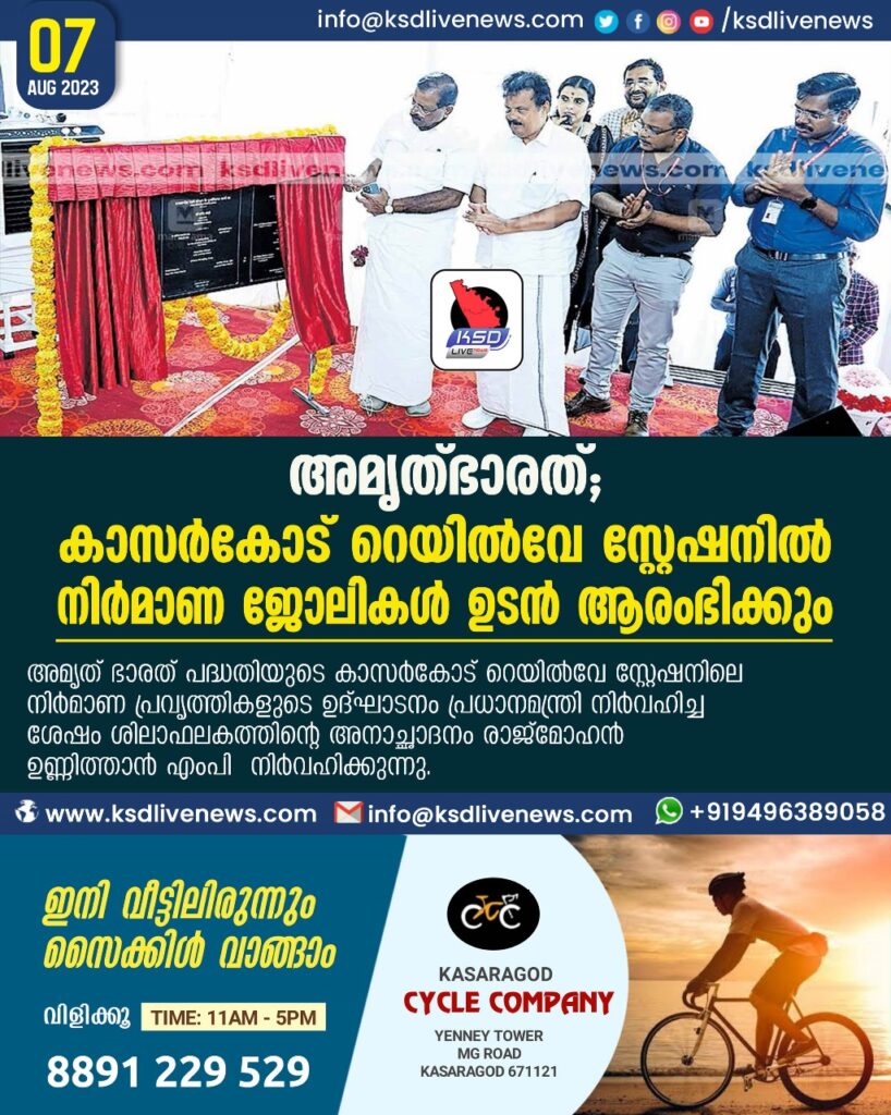 കാസർകോട്: അമൃത് ഭാരത് സ്റ്റേഷൻ പദ്ധതിയിൽ ഉൾപ്പെടുത്തി കാസർകോട് റെയിൽവേ സ്റ്റേഷൻ നവീകരണ പ്രവർത്തനങ്ങളുടെ ശിലാസ്ഥാപനം പ്രധാന മന്ത്രി നരേന്ദ്രമോദി ഓൺലൈനിൽ ഉദ്ഘാടനം ചെയ്തു. രാജ്യത്തിന്റെ റെയിൽവേ രംഗത്ത് പുതിയൊരു അധ്യായം ആരംഭിക്കുകയാണെന്നും 508 റെയിൽവേ സ്റ്റേഷനുകൾ അതിന്റെ ഭാഗമാകുകയാണെന്നും പ്രധാനമന്ത്രി പറഞ്ഞു. രാജ്യത്തെ ചെറിയ നഗരങ്ങളാണ് അമൃത് ഭാരത് സ്റ്റേഷൻ പദ്ധതിയിലൂടെ നവീകരിക്കപ്പെടുന്നത് പദ്ധതി യാഥാർഥ്യമാകുന്നതോടെ കർഷകർക്കും സാധാരണക്കാർക്കും ഏറെ ഗുണകരമാകുമെന്നും അദ്ദേഹം പറഞ്ഞു. കേന്ദ്ര റെയിൽവേ മന്ത്രി അശ്വിനി വൈഷ്ണവ് അധ്യക്ഷനായി.